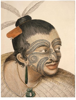 A Māori chief with tattoos (moko) seen by James Cook and his crew. Warfare between tribes was common, generally over land conflicts or to restore mana. Fighting was carried out between sub tribes. Māori were known to some times eat their enemies.